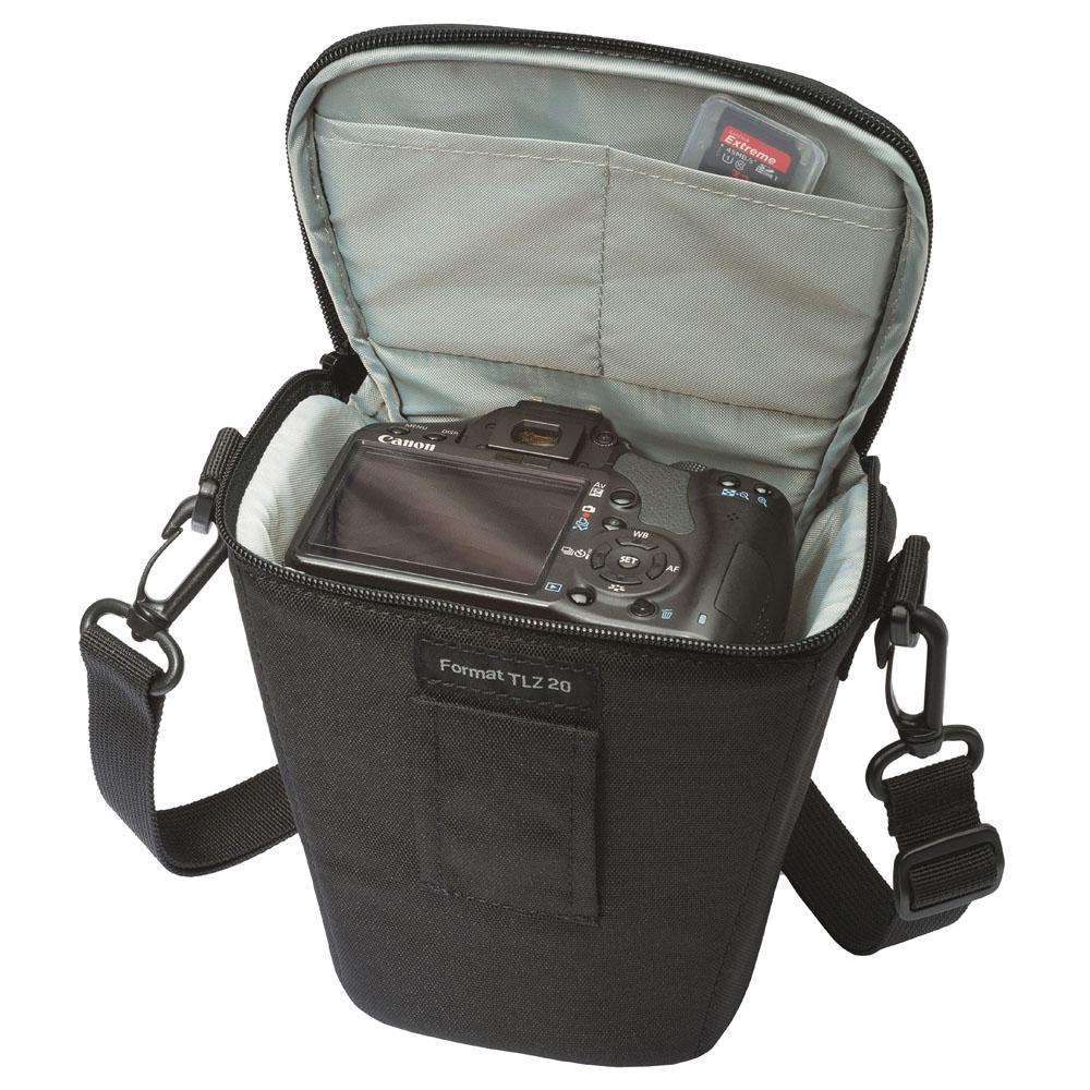 Este belo modelo da Lowepro é perfeito para armazenar uma câmera DSLR com lente acoplada ou super zoom. Além disso, tem compartimentos para os acessórios e alças de mão e tiracolo.